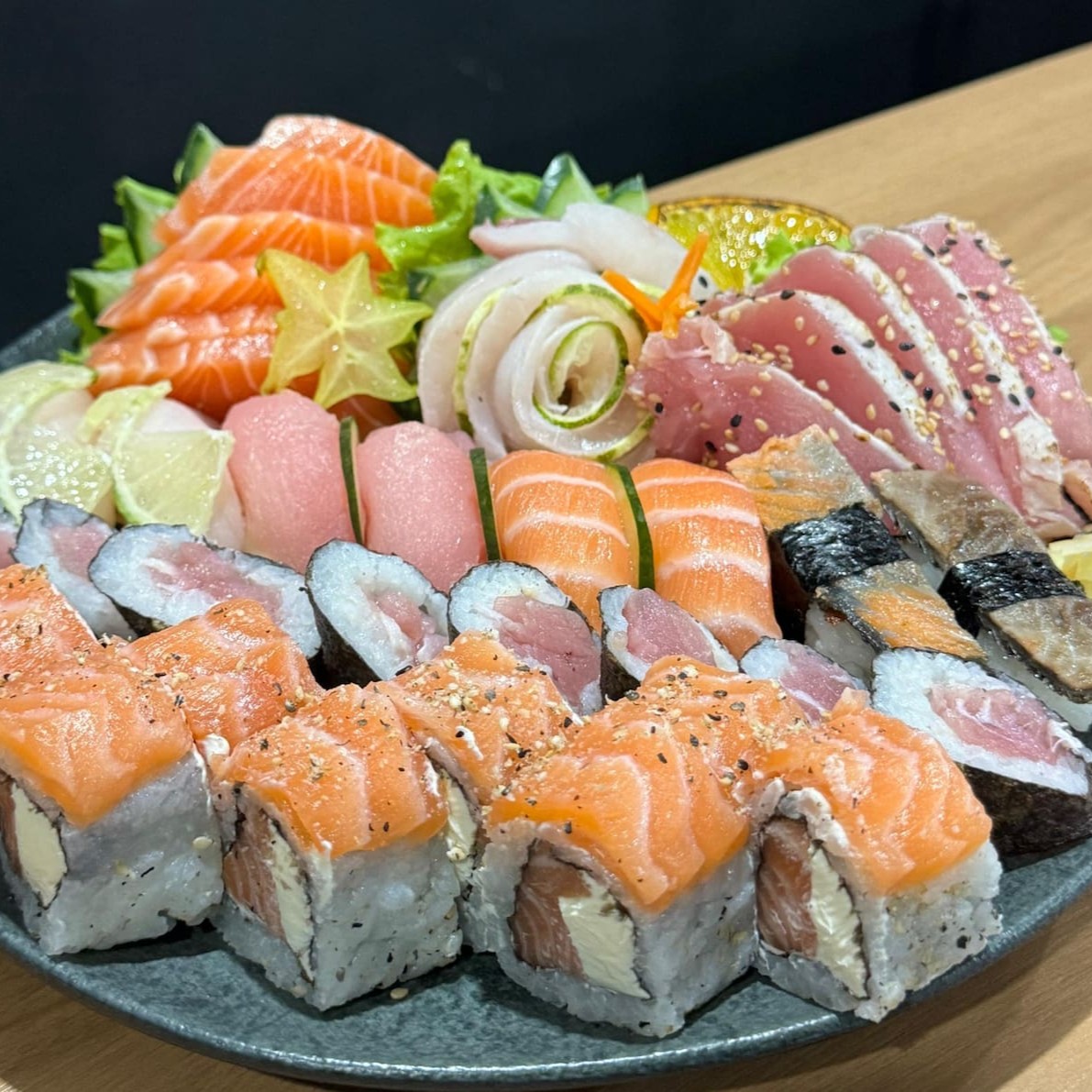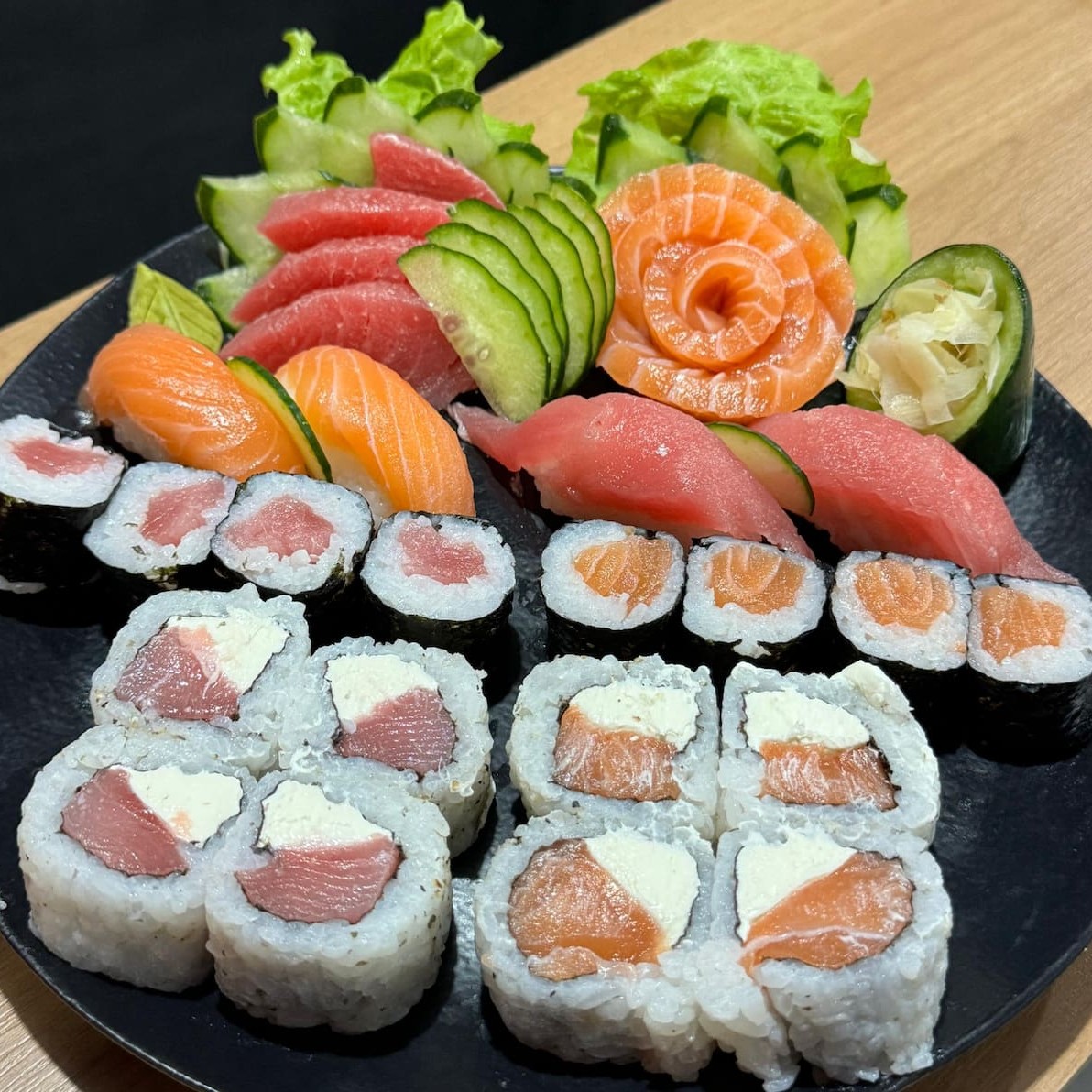 6un sashimi atum na crosta gergelim 6un sashimi salmão 2un Niguiri salmão 2un niguiri tilapia 2 niguiri atum 8un uramaki Filadélfia especial 8un un hossomaki atum 2un niguiri skin 6un sashimi tilapia 8un hot Filadélfia