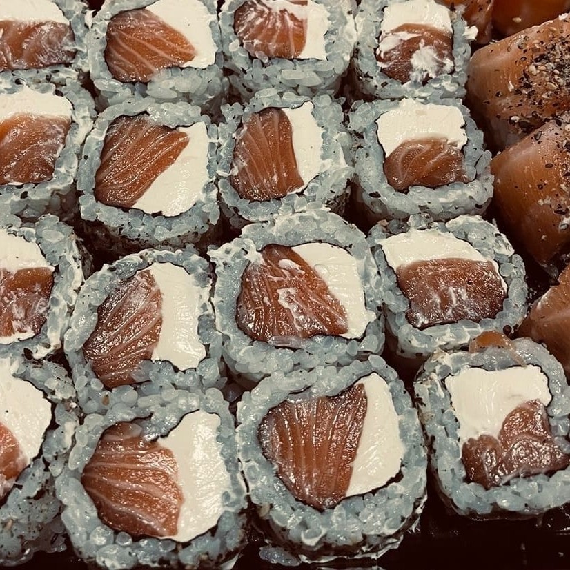 12 sashimi salmao, 6 joe salmao, 4 uramaki Filadélfia, 4 uramaki especial,8 niguiri salmão, 8 hossomaki salmão, 8 hot Filadélfia + 1,5l caipirinha.