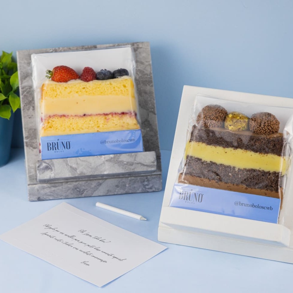 (Obs.: Informar o código de recebimento para o destinatário) Envie para o aniversariante do Dia! Duas fatias dos famosos naked cakes do Bruno Bolos, um cartão com mensagem personalizada e uma vela de aniversário. Escolha os sabores das slices, e escreva o nome do destinatário juntamente com o recado do cartão nas observações do pedido.