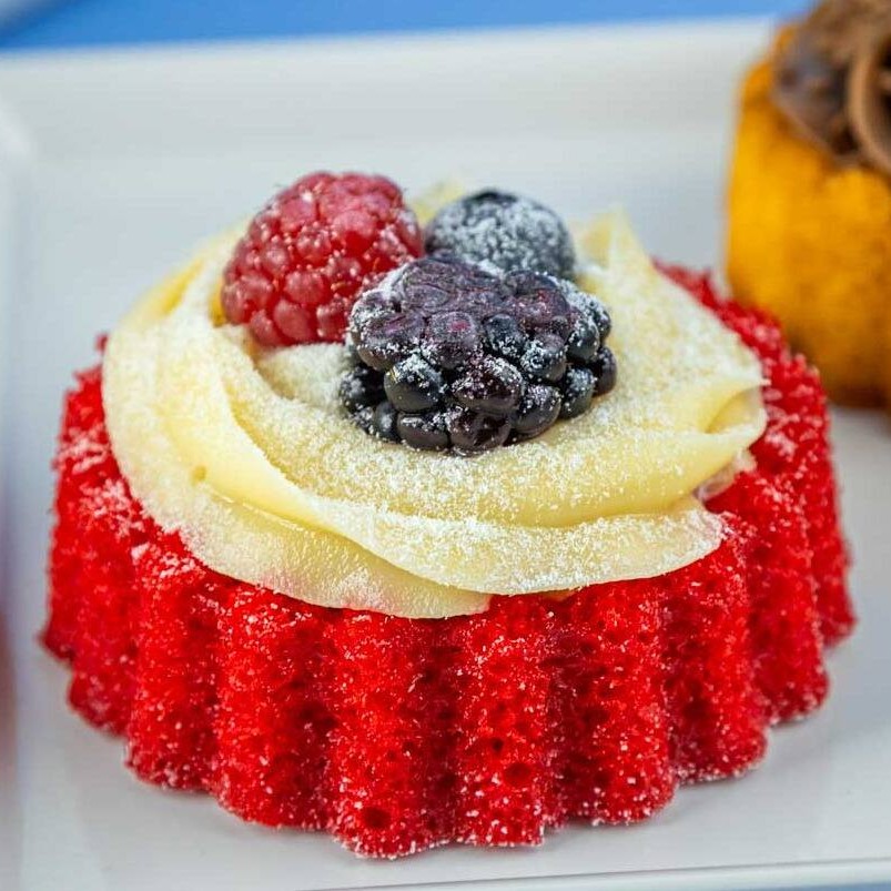 Massa red velvet, cobertura de 4 leites e geleia de frutas vermelhas e decorado com frutas vermelhas. Aprox. 90g