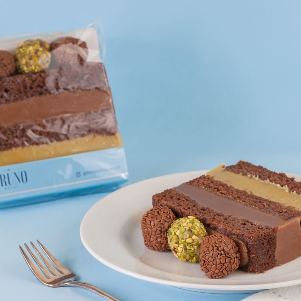 Massa de chocolate molhadinha, recheio de brigadeiro cremoso de chocolate, brigadeiro cremoso de pistache, decorado com bolinhas de brigadeiro belga e pistache. 200g aprox.