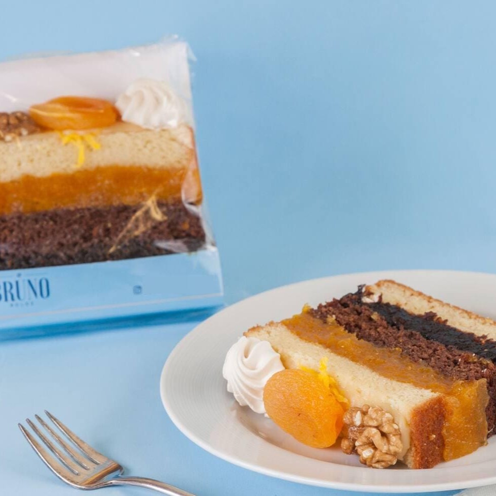 Massa de chocolate molhadinha, recheio de ameixa, massa branca molhadinha, recheio de damasco, decorada com nozes, ameixa e damasco. 200g aprox.