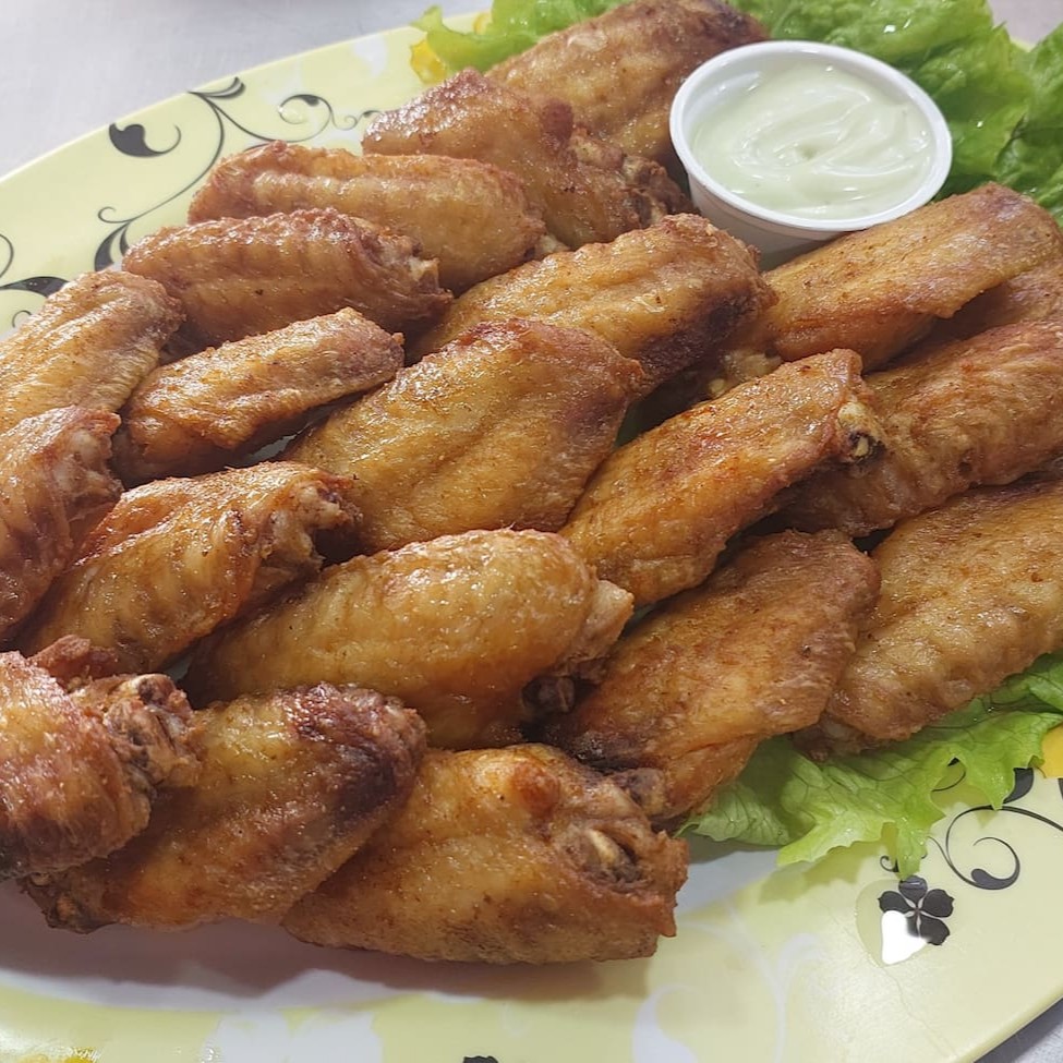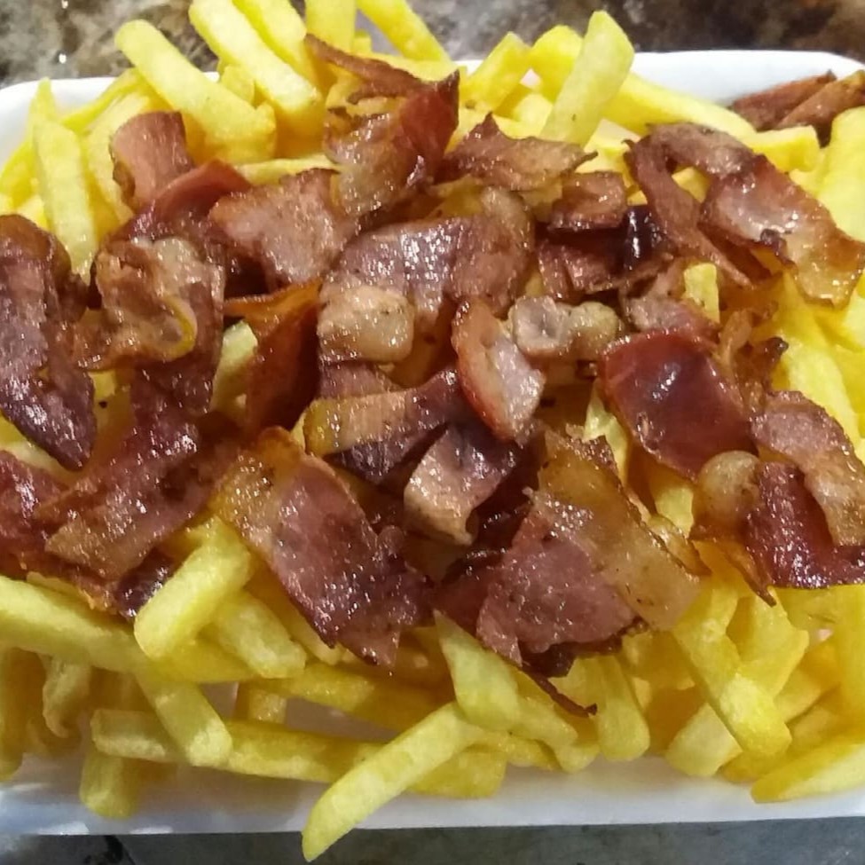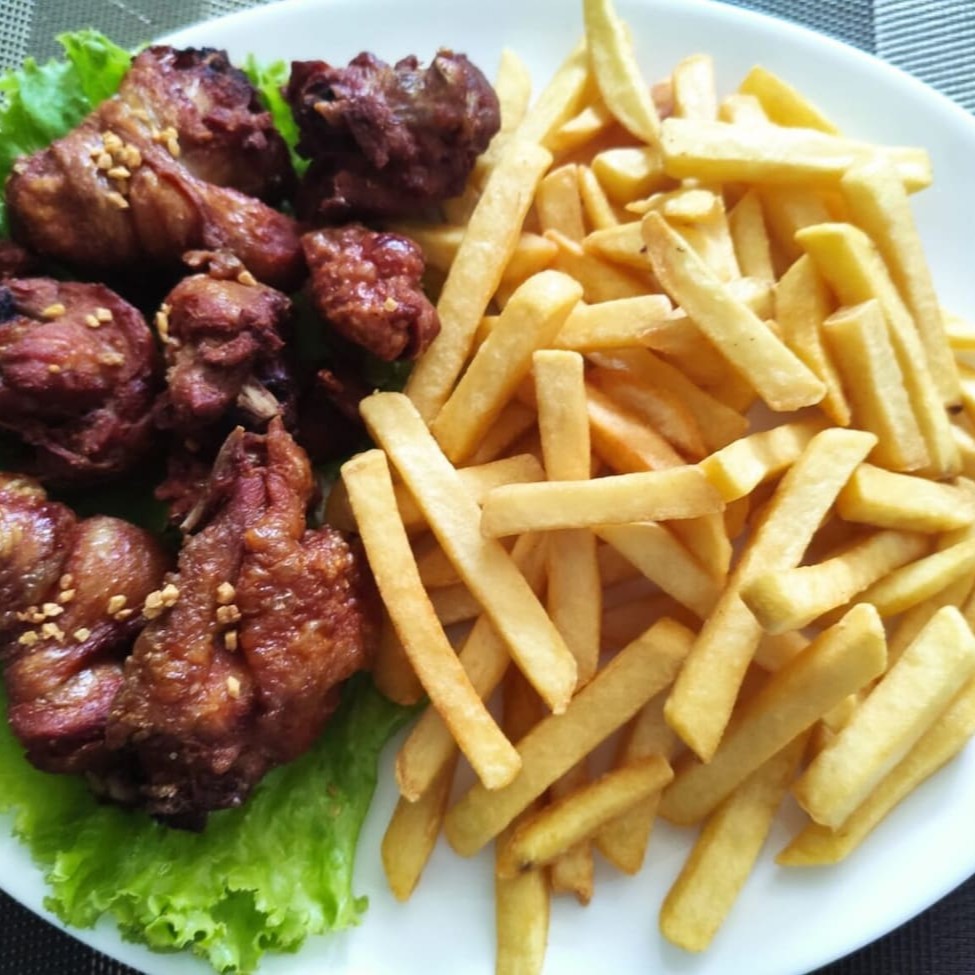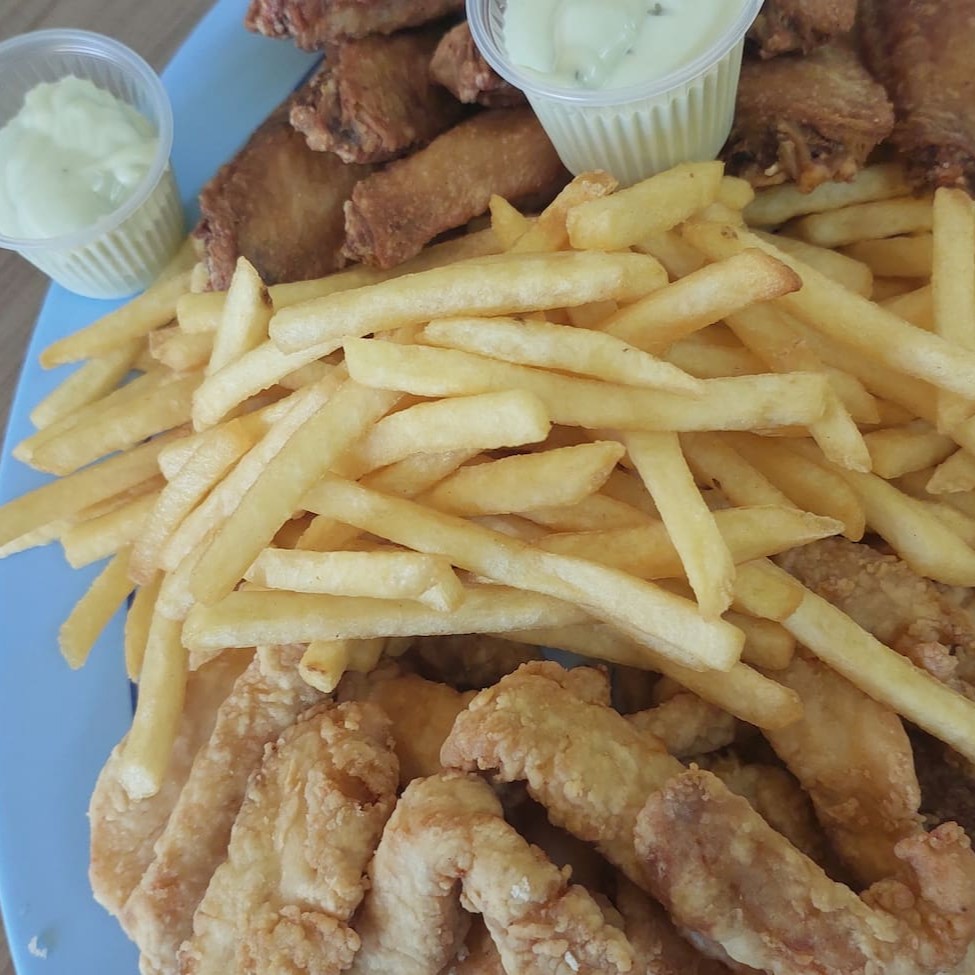 500 gramas de frango a passarinho + 350 gramas de batata, molhos.