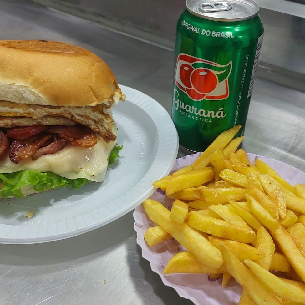 Pão, hamburger brasa 90gr, maionese, alface, tomate, queijo, presunto, bacom, calabresa, ovo, batata frita e Guaraná lata, 350ml