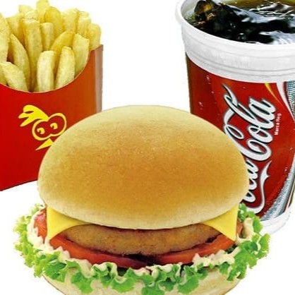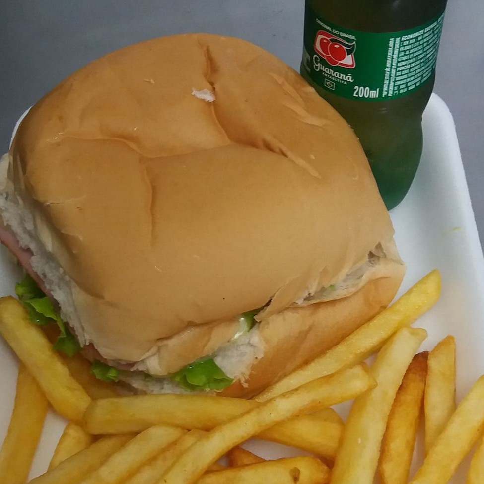 Pão, hamburger, queijo, presunto, maionese, alface, tomate, frita e refri 200ml