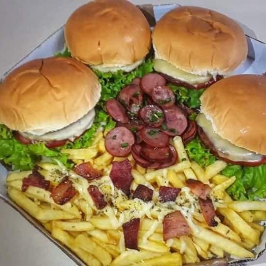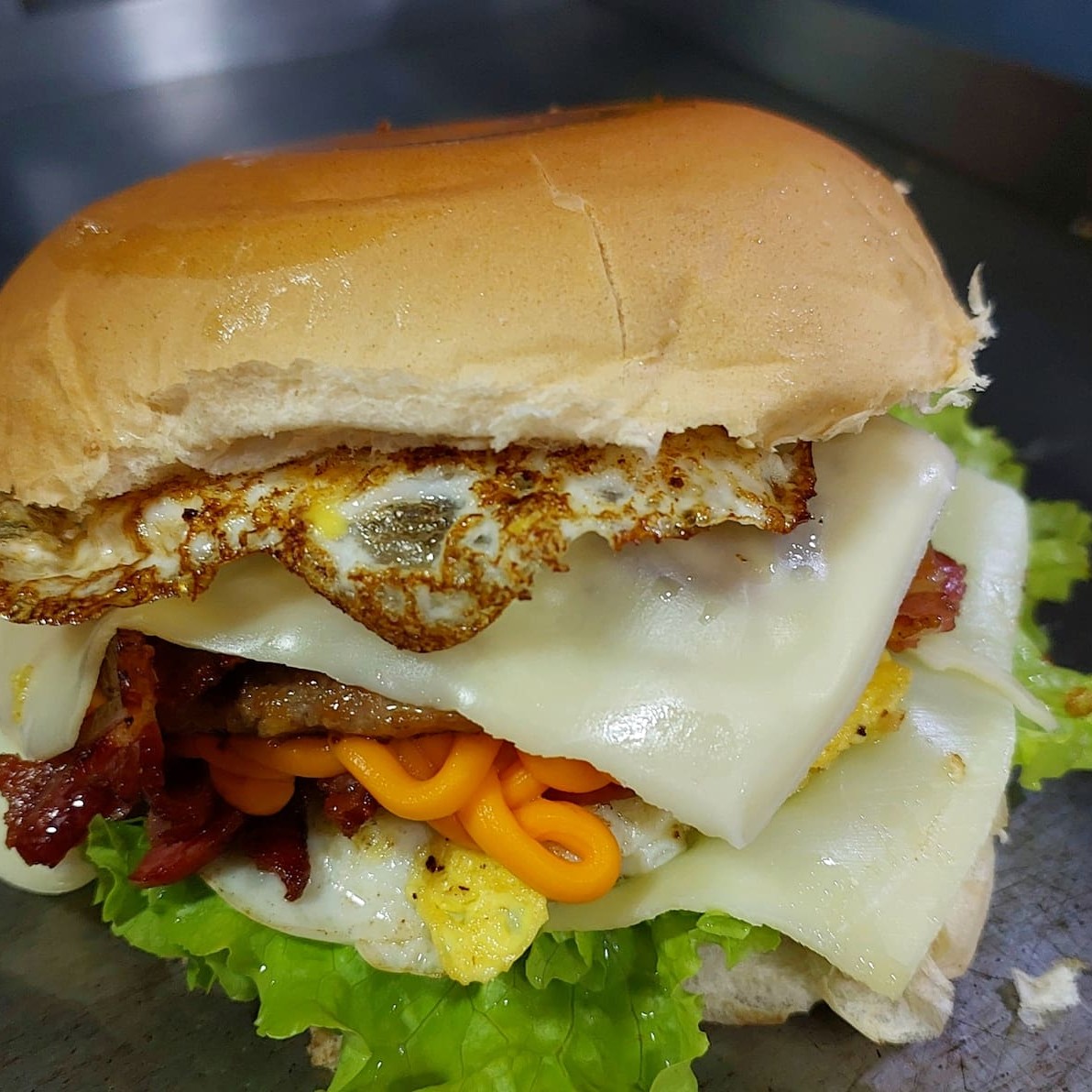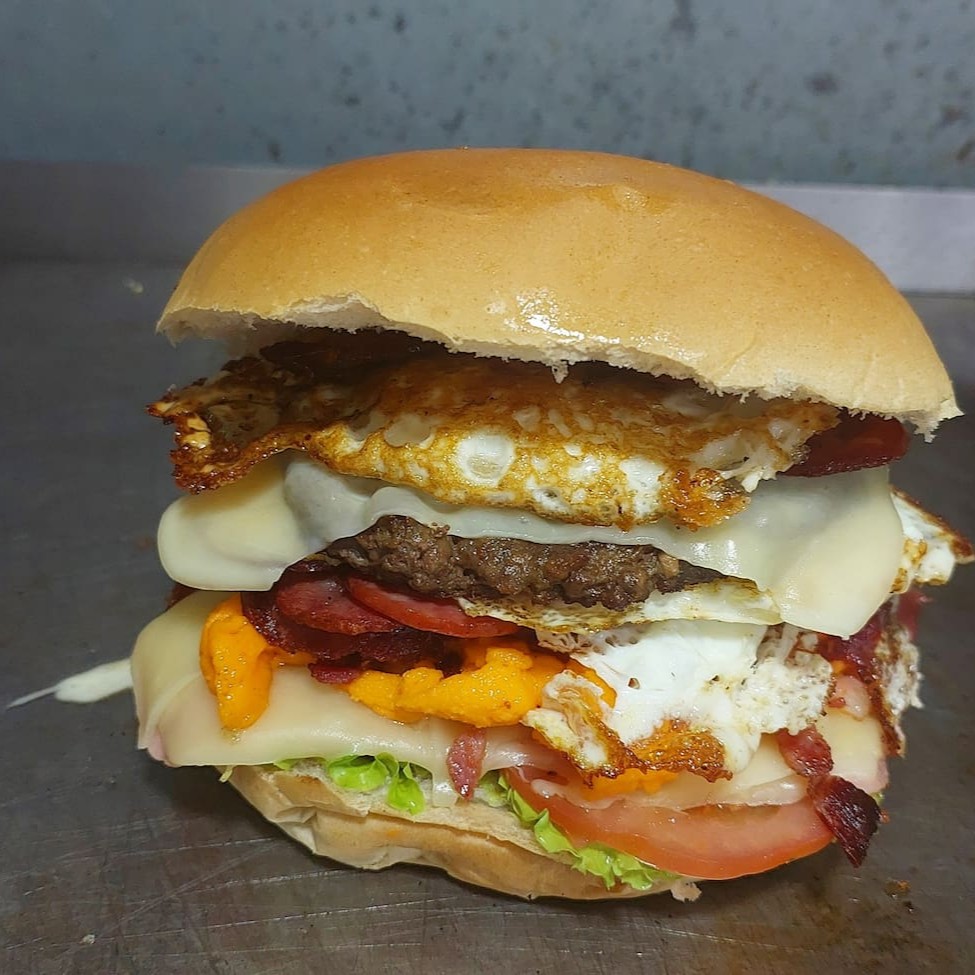 Pão tamanho G, Hamburger brasa 90 Gr, Bacom, Calabresa Cheddar, Duplo Queijo Mussarela, Duplo Ovo, Alface, Tomate