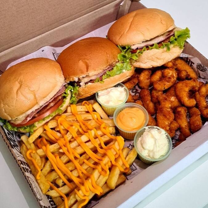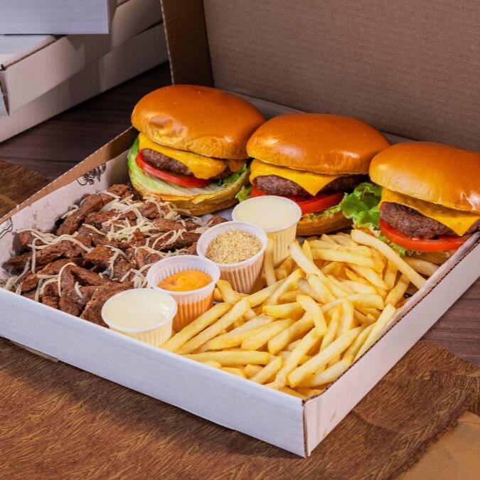 Deliciosa porção de miolo da alcatra, + 3 burguer artesanal com molho especial ( com picles ) + batata frita, acompanha maionese da casa e molho especial, combo perfeito para 3 pessoas