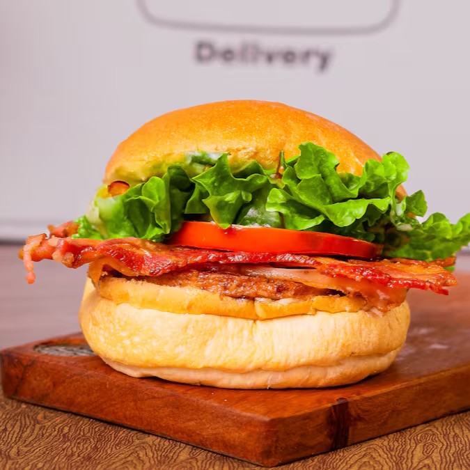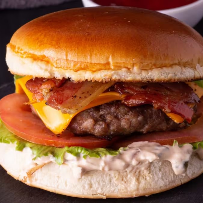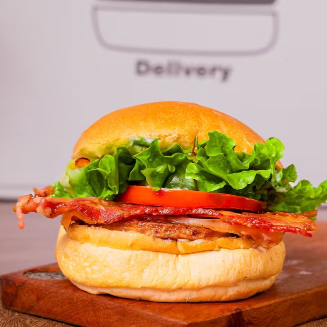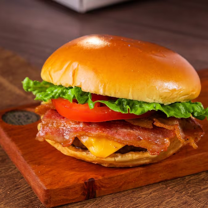 Pão Brioche selado na chapa, molho tasty (com picles) delicioso hambúrguer artesanal de 120g, queijo cheddar, tiras de bacon crocante, tomate e alface americana.