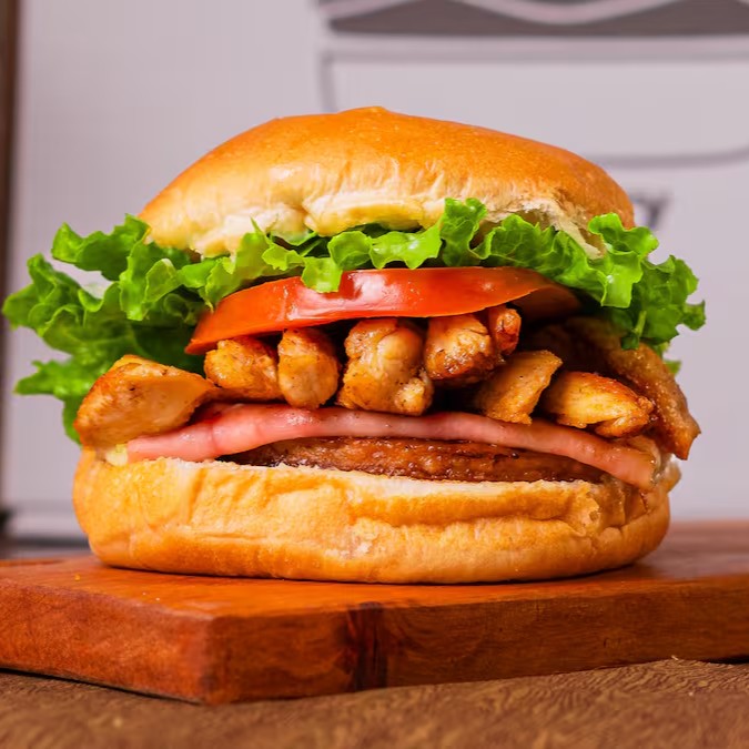 Pão fresquinho sem conservantes, saboroso frango em cubos feito na chapa, deliciosa maionese da casa , hambúrguer tradicional 56g, queijo, presunto, alface e tomate, O Verdadeiro Frango Tradicional.