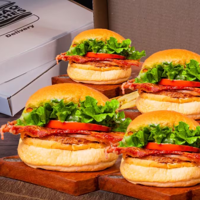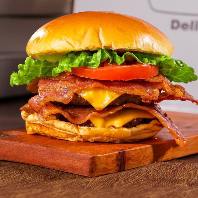 Pão Brioche selado na chapa, molho tasty (com picles) duplo hambúrguer artesanal 120g, duplo queijo cheddar, dupla camada de tiras de bacon crocante, tomate e alface americana