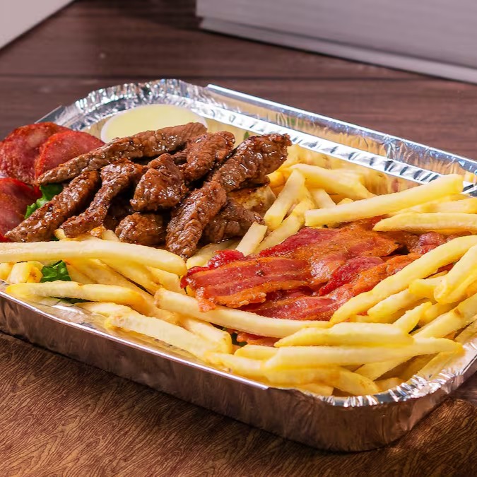 Deliciosas tiras de miolo de alcatra, batata + 2 x saladas tradicionais ( hambúrguer 56g) perfeito para 2 pessoas, acompanha maionese da casa + farofa.
