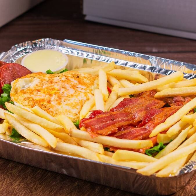 Pão fresquinho sem conservantes, deliciosa maionese da casa, hambúrguer artesanal, bacon crocante em tiras, calabresa em tiras, ovo , presunto, queijo, alface, tomate e 200g batata frita especial.
