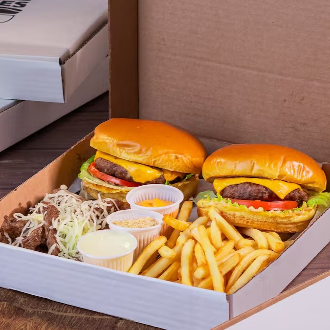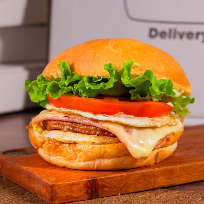 Pão Brioche selado na chapa, molho tasty (com picles) delicioso hambúrguer artesanal de 120g, 2 fatias de queijo cheddar, queijo cheddar processado, tomate e alface americana.