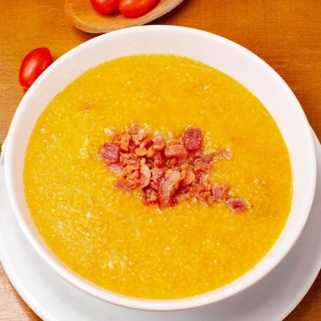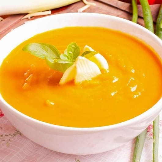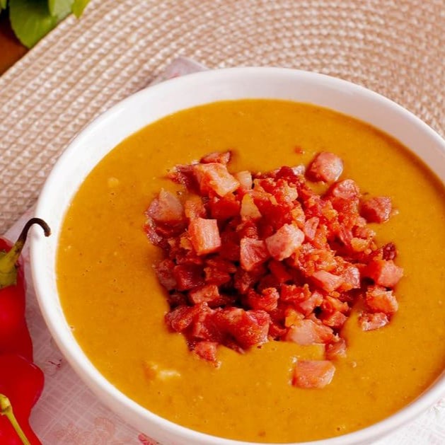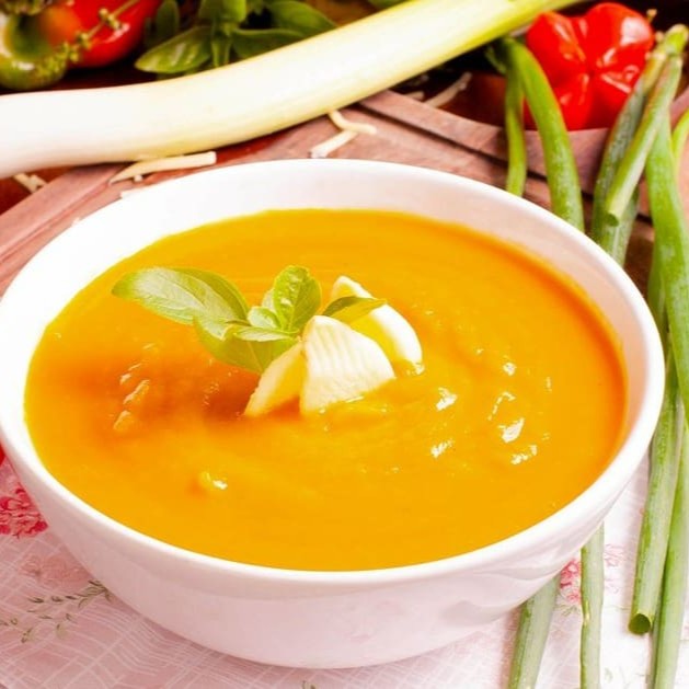 Abóbora japonesa, cenoura, leite de coco e um toque de gengibre.