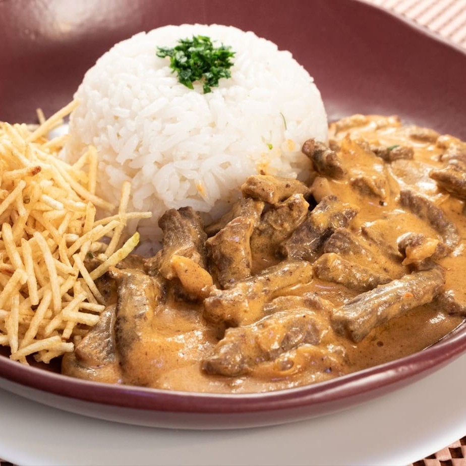 Nosso strogonoff de carne é feito com suculenta carne bovina (patinho), envolvida em um delicioso molho à base de creme de leite, molho de tomate, champignon, um toque de mostarda e catchup. Acompanha arroz branco soltinho e batata palha crocante, garantindo uma refeição clássica e irresistível!