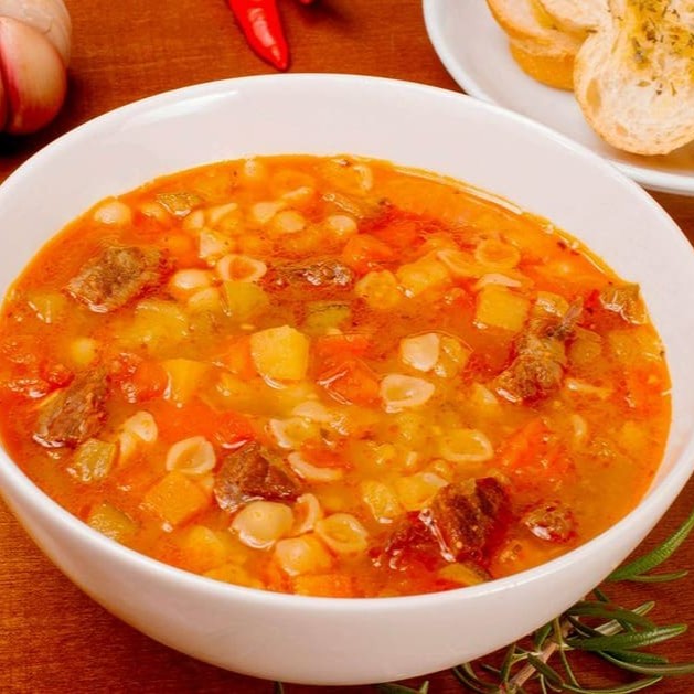 Sopinha de carne com batata, macarrão , cenoura, abobrinha, mandioquinha e tomate.