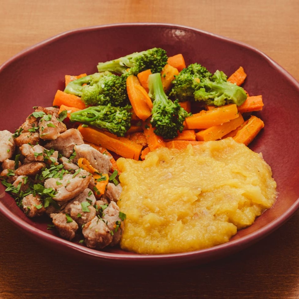 Purê de batata salsa, mignon suíno e legumes (brócolis e cenouras).