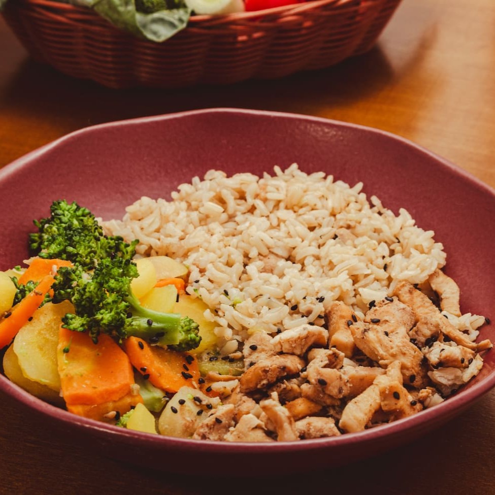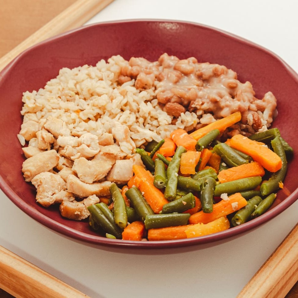 Arroz integral, frango em tiras, feijão branco e legumes (cenouras e vagem).