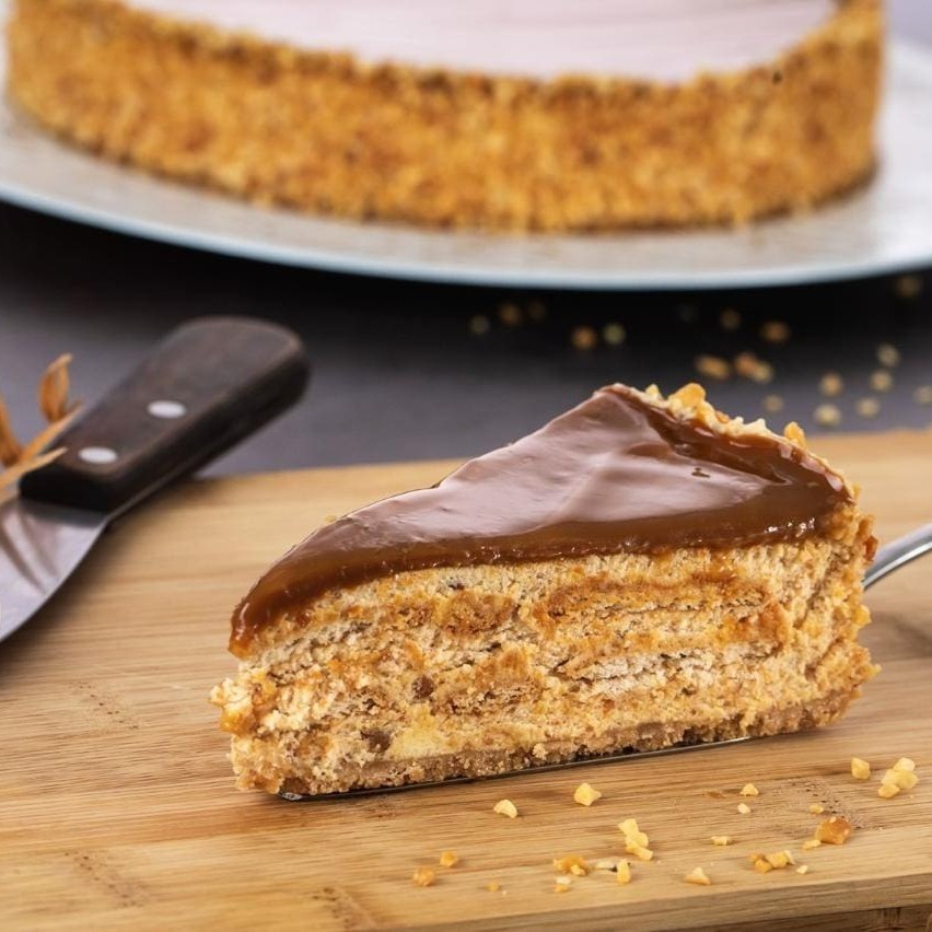 Nossa Torta Crocante de Amendoim com Doce de Leite é uma combinação perfeita de texturas e sabores. Feita com uma base deliciosa de biscoito e creme de amendoim, é finalizada com uma generosa camada de doce de leite e uma decoração de amendoim crocante. Cada fatia traz o equilíbrio entre o sabor intenso do amendoim e o toque adocicado do doce de leite, oferecendo uma experiência única e irresistível. Perfeita para os apaixonados por sobremesas intensas e crocantes!