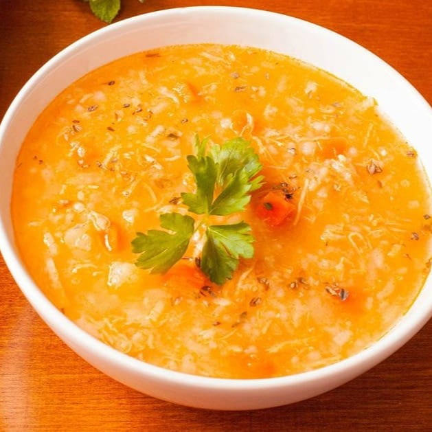 Canja caipira feita com frango desfiado, arroz, cenoura... Temperinho especial da vovó