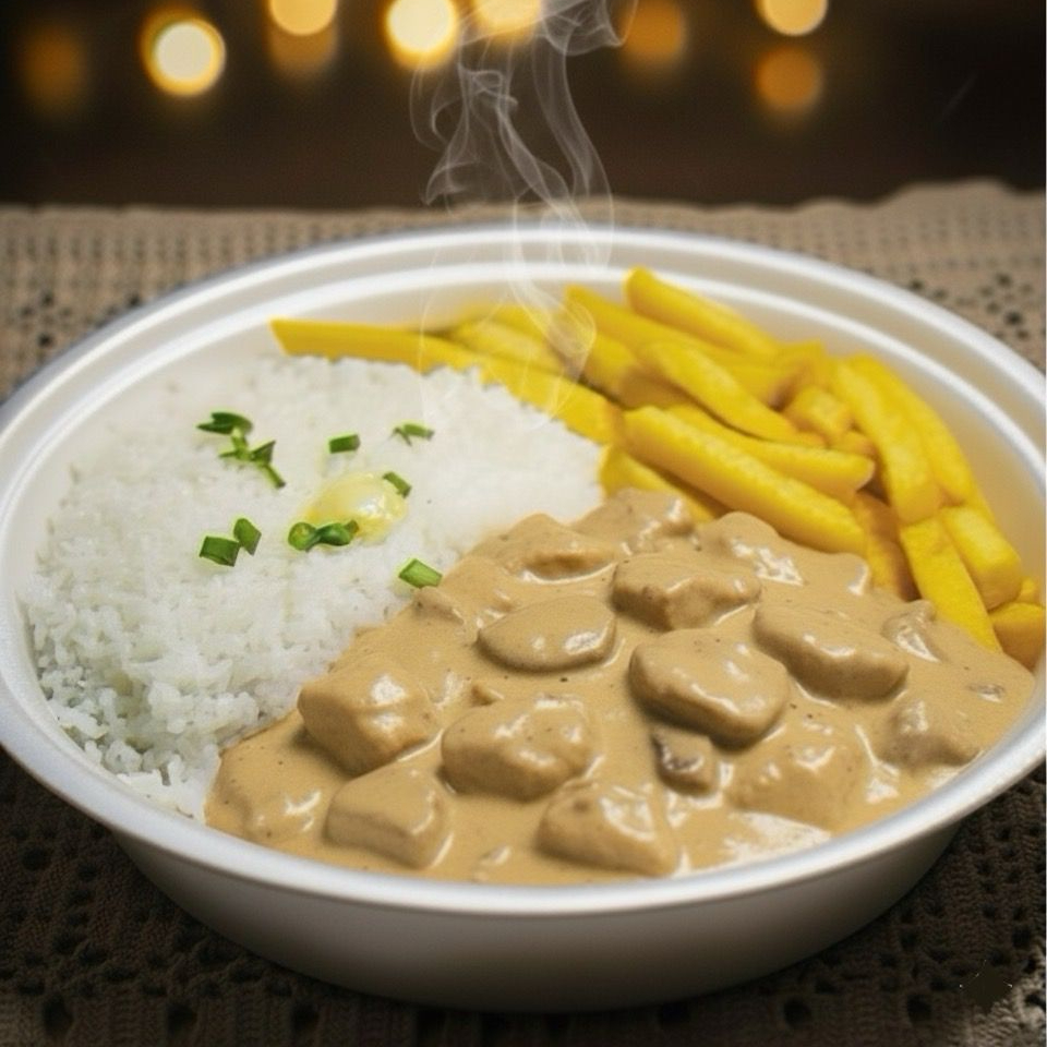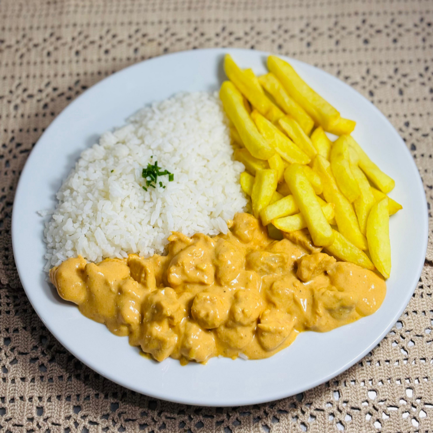 Acompanha Strogonoff Cremoso, Arroz branco e Batata Frita. Indicada para 1 pessoas. aprox (450g)