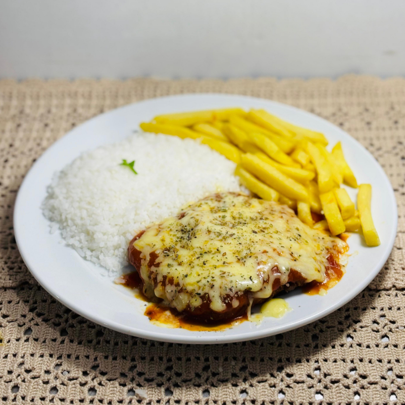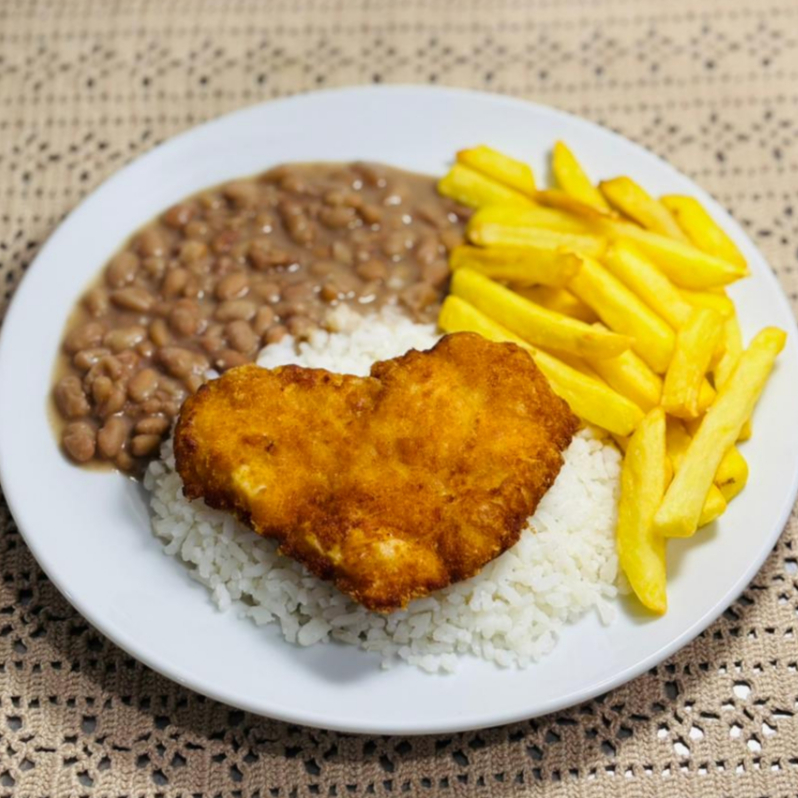 Acompanha Frango à Milanesa empanado, Feijao branco, Batata frita e arroz branco. Indicada para 1 pessoa (aprox 450g)