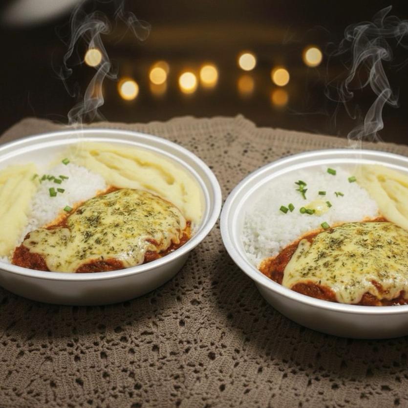 2 Marmitas de Frango Parmegiana com Fritas. Acompanha Frango crocante empanado com molho artesanal e queijo, arroz branco e batata frita. Indicada para 2 pessoas. aprox (450g cada)