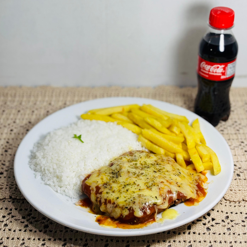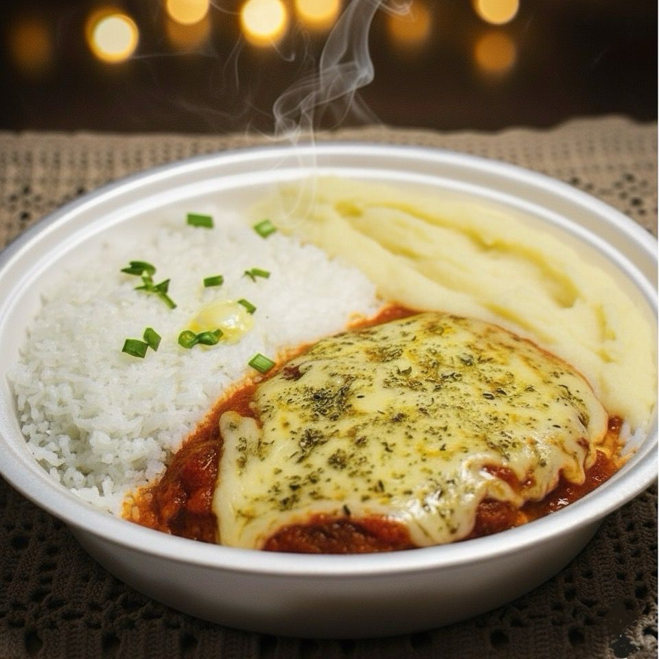 Marmita com delicioso filé de frango parmegiana (empanado na massa crocante coberto com molho de tomates e queijo) acompanhado de arroz branco e purê de batatas inglesas. Acompanha refrigerante pet Coca Cola bem gelado. Marmita indicada para 01 pessoa.