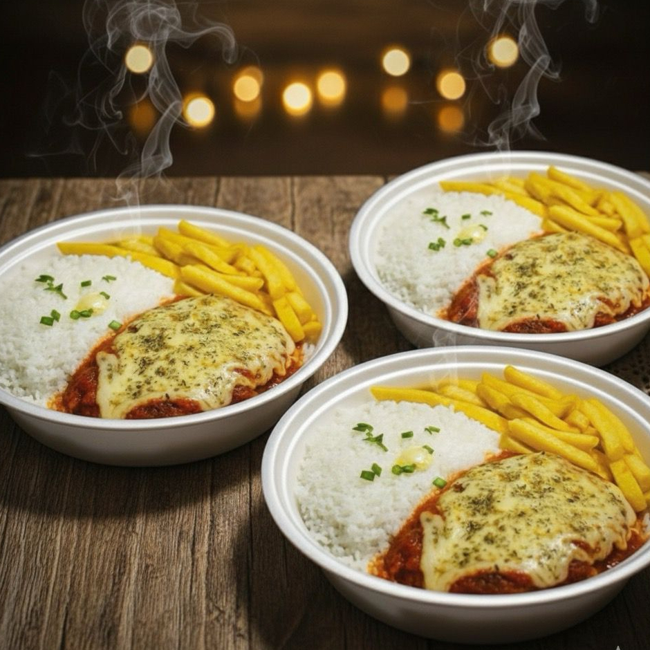 3 Marmitas de Frango Parmegiana com Fritas. Acompanha Frango crocante empanado com molho artesanal e queijo, arroz branco e batata frita. Indicada para 3 pessoas. aprox (450g cada)