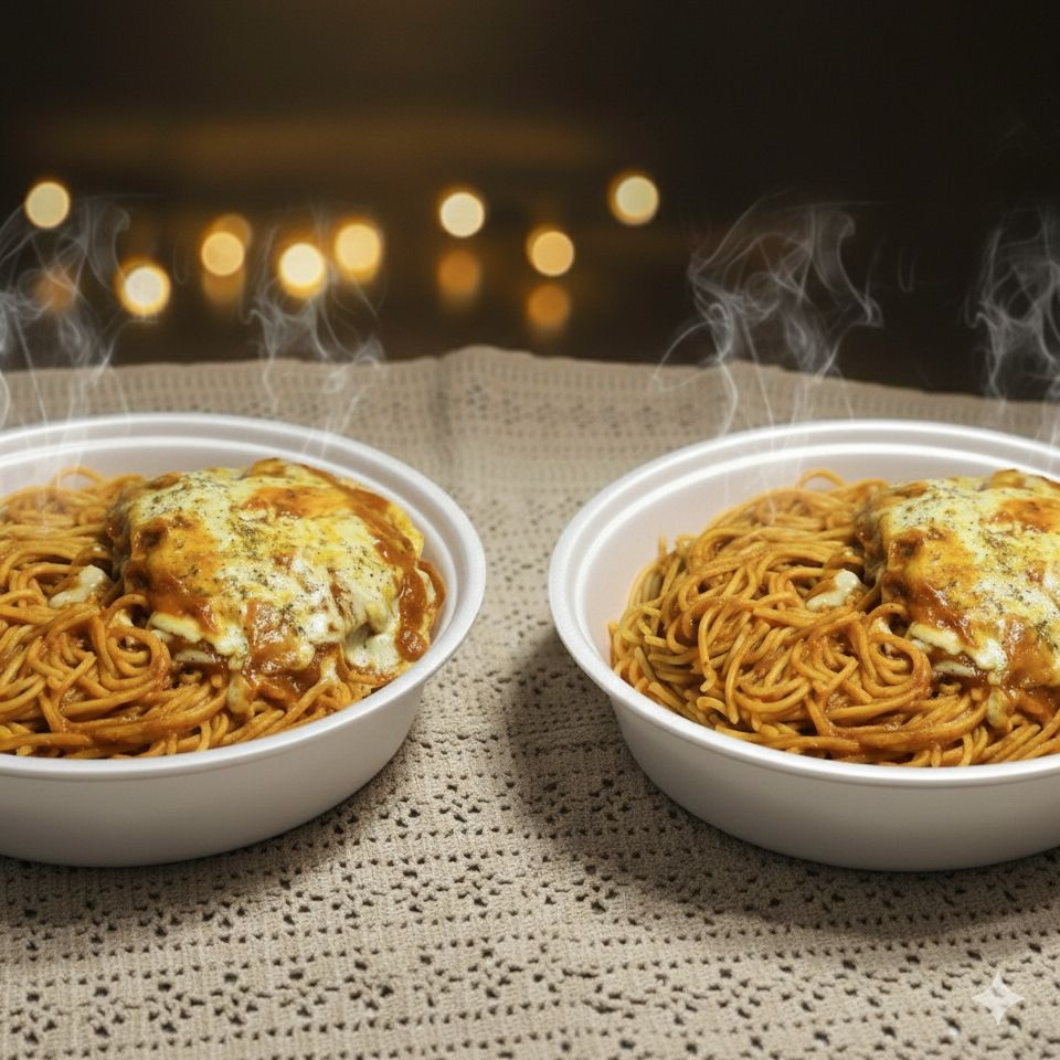 2 marmitas com Macarrão ao molho, frango empanado, molho artesanal e queijo com orégano. Aprox: 900g (serve 2 pessoas)