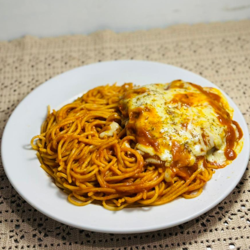 Frango empanado com molho artesanal, queijo derretido com orégano e macarrão. Aprox 450g (serve 1 pessoa)