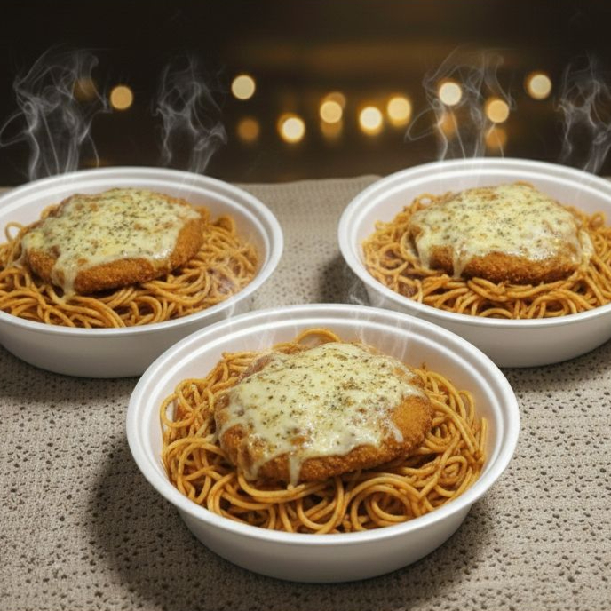 Acompanha 3 marmitas com : Frango empanado, molho artesanal, queijo derretido, orégano e macarrão da casa. Aprox : 1350g