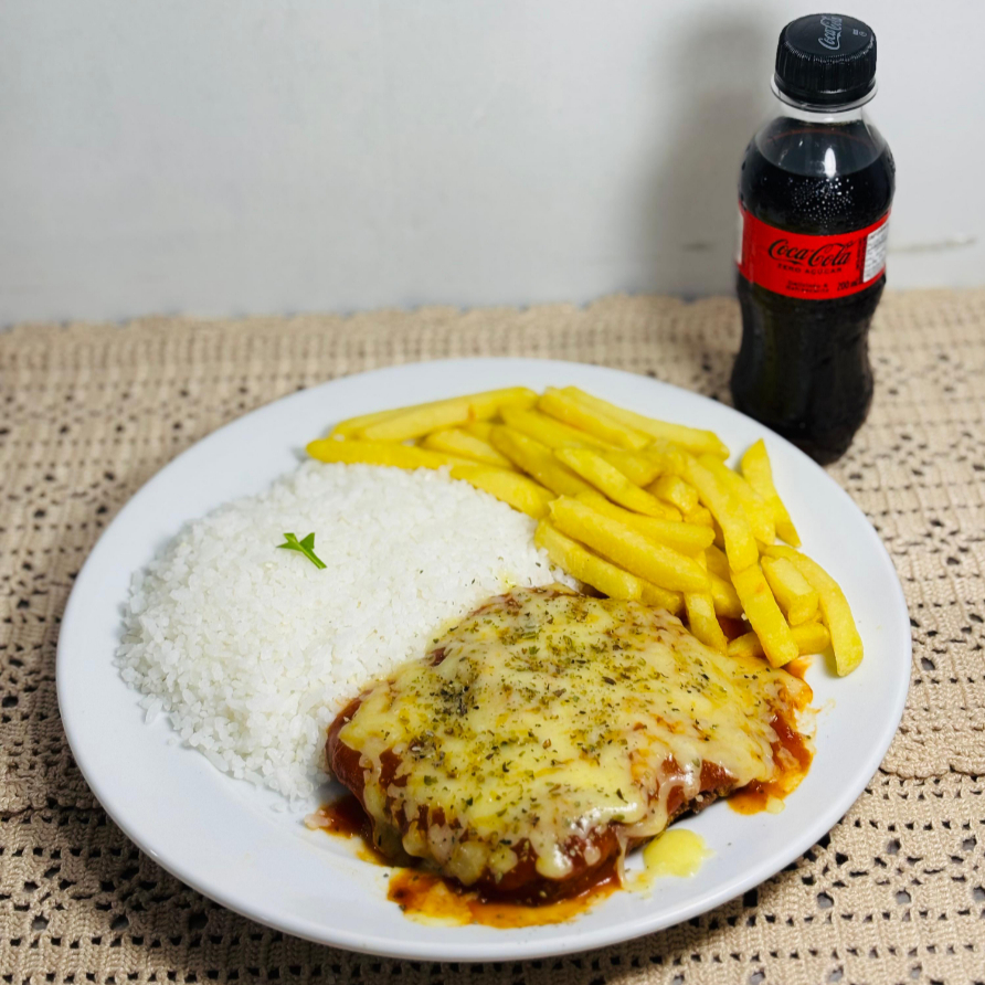 Marmita com delicioso filé de frango parmegiana (empanado na massa crocante coberto com molho de tomates e queijo) acompanhado de arroz branco e batatas fritas. Acompanha refrigerante pet Coca Cola Zero sem açúcar bem gelado. Marmita indicada para 01 pessoa.