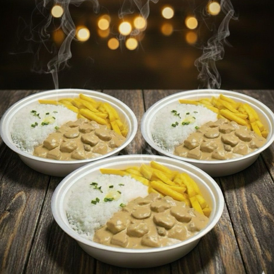 3 Marmitas de Strogonoff de Frango. Acompanha Strogonoff Cremoso, Arroz branco e Batata Frita. Indicada para 2 pessoas. aprox (450g cada)
