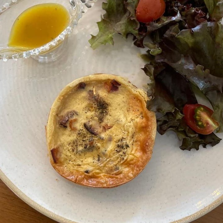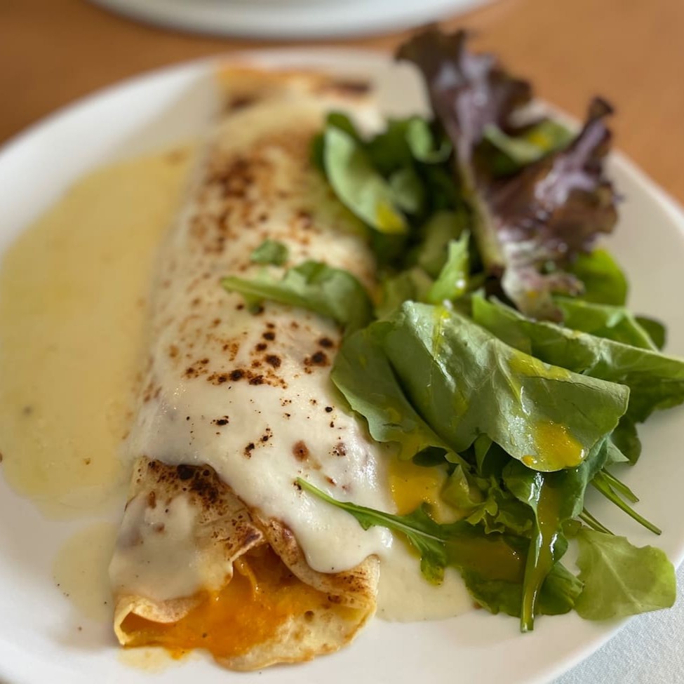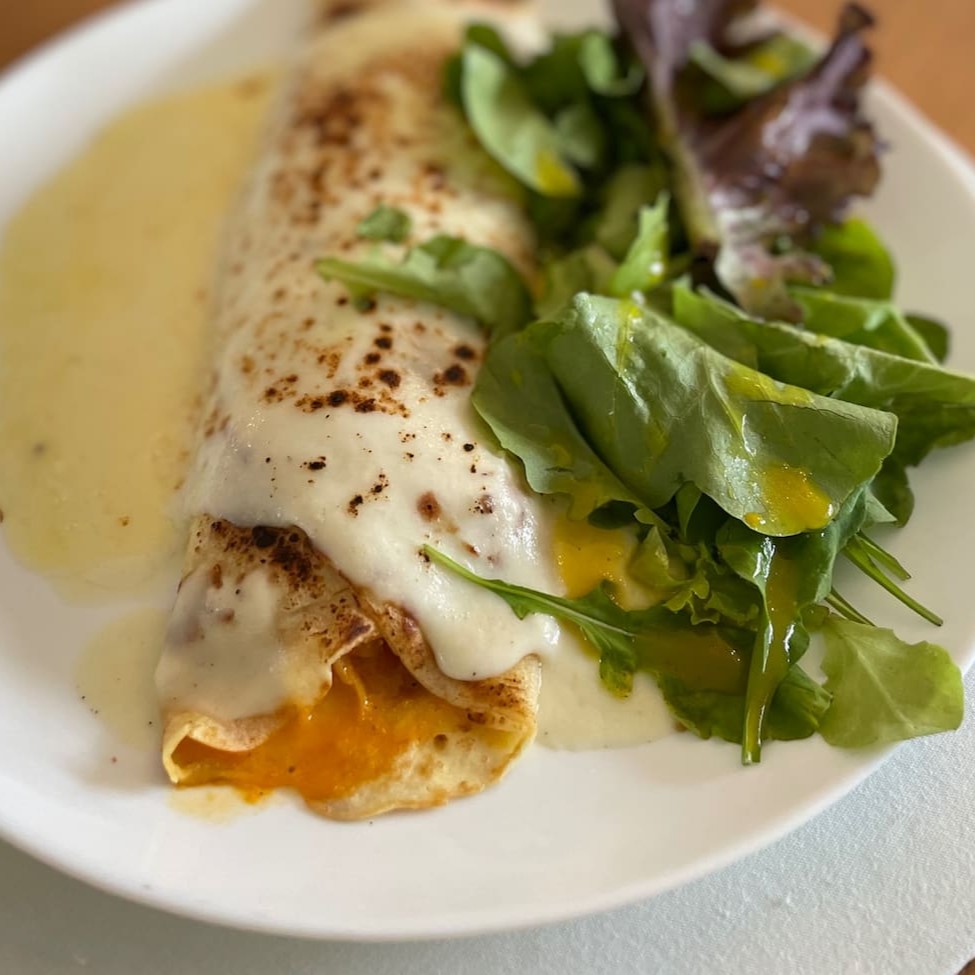 Panqueca recheada com carne moida , molho bechamel e queijo, acompanha mini salada e molho de mostarda e mel.