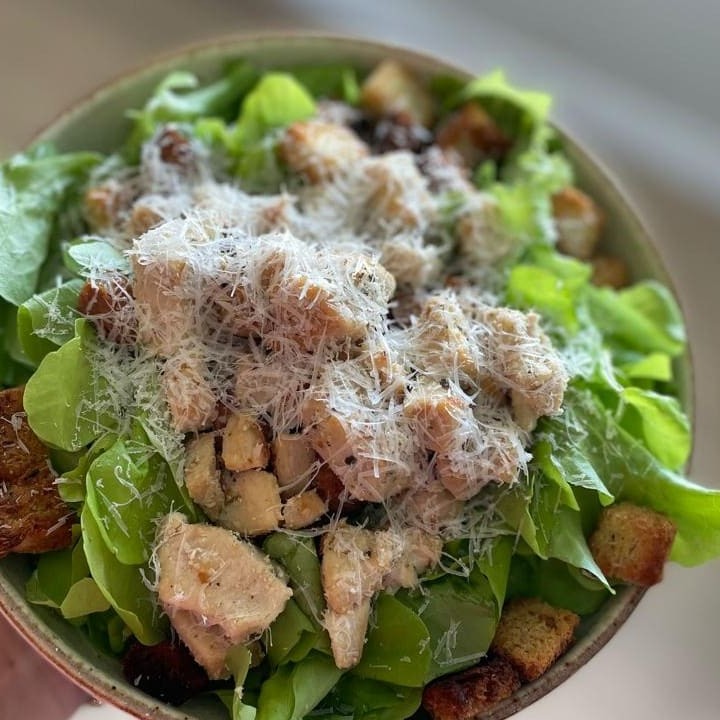 Folhas Queijo Parmesão Ralado Frango grelhado Molho Especial , maionese , mostarda, limão Crotouns