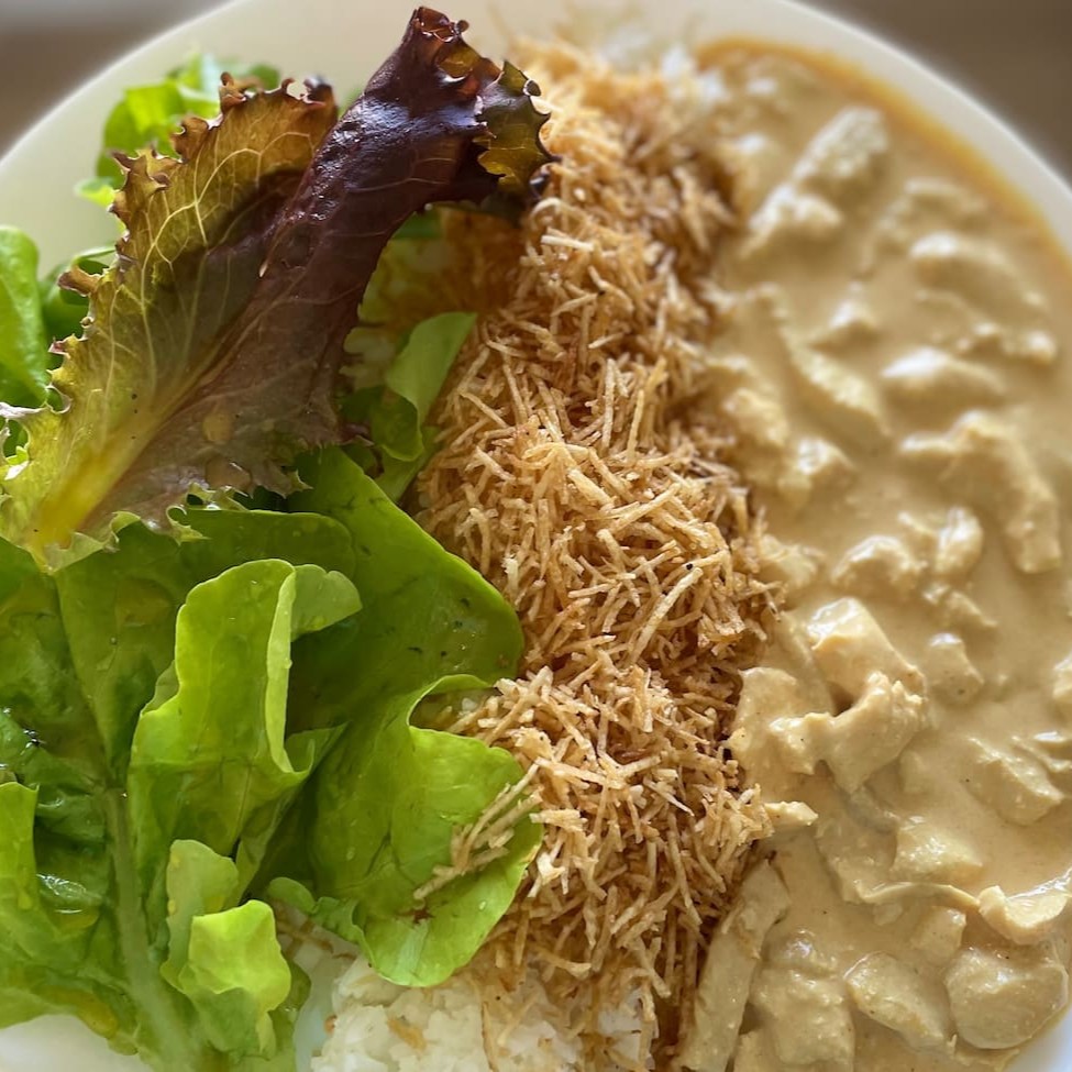 Strogonoff De Frango , acompanha batata palha e arroz, mini salada com molho de mostarda e mel