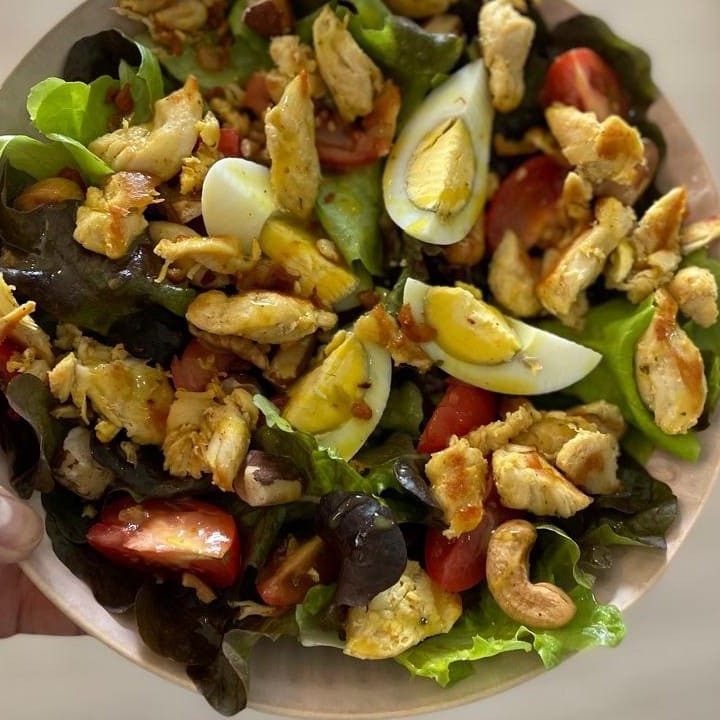 Salada De Folhas Tomate Cereja Ovos Cozidos Castanhas E Nozes Frango Grelhado Molho De Mostarda E Mel