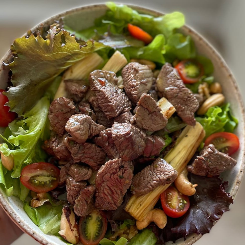 Salada de folhas com mignon grelhado , tomate cereja , castanhas , palmito e molho de mostarda e mel