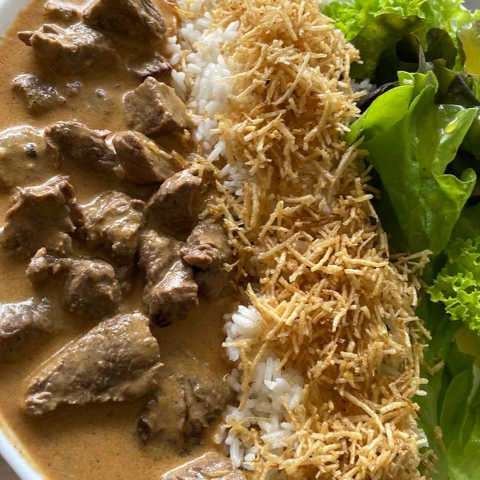 Strogonoff de mignon acompanha batata palha arroz e salada com molho de mostarda e mel