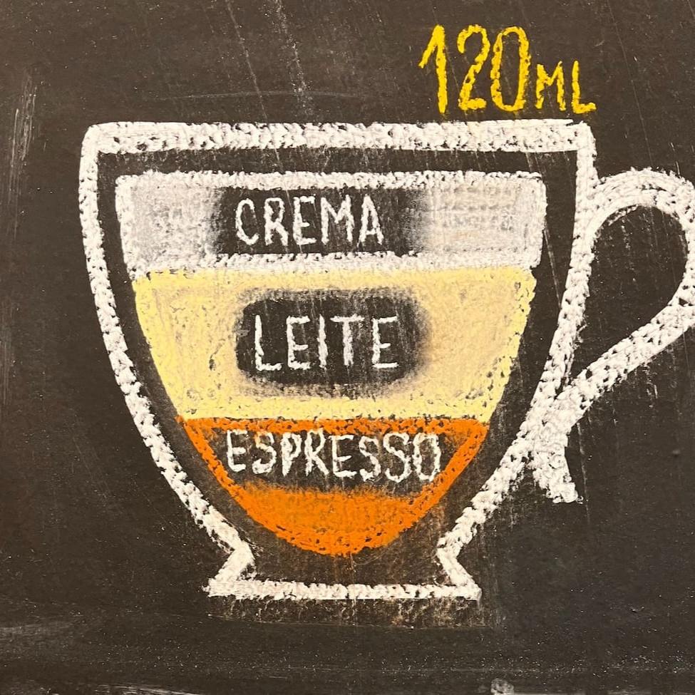 Espresso, duas doses de leite vaporizado e crema do leite.