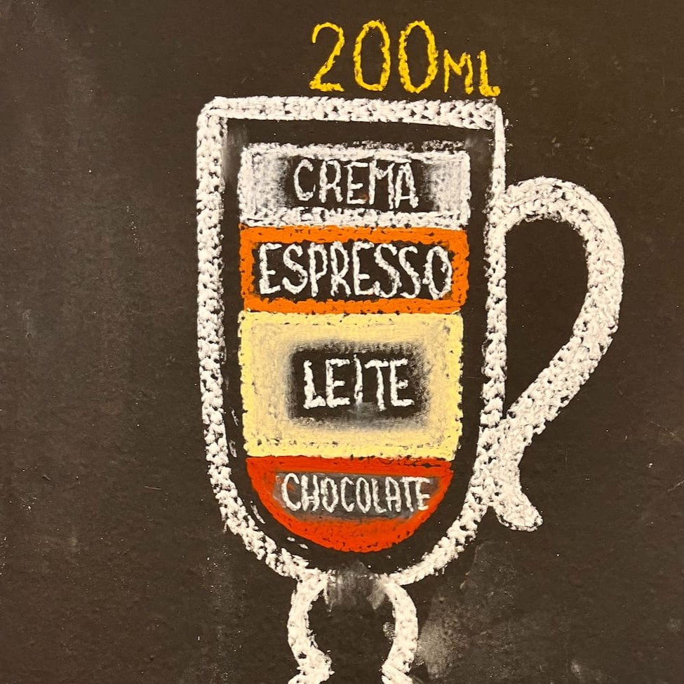 Espresso, leite vaporizado, crema do leite, polvilhado com cacau e canela.