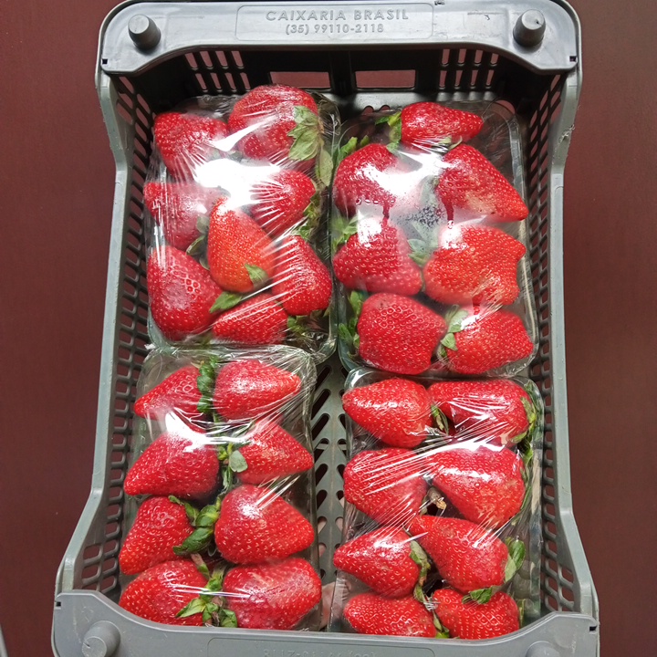 Morangos frescos selecionados, tamanhos médio e graúdo. Produto natural, com variação de tamanho conforme disponibilidade.