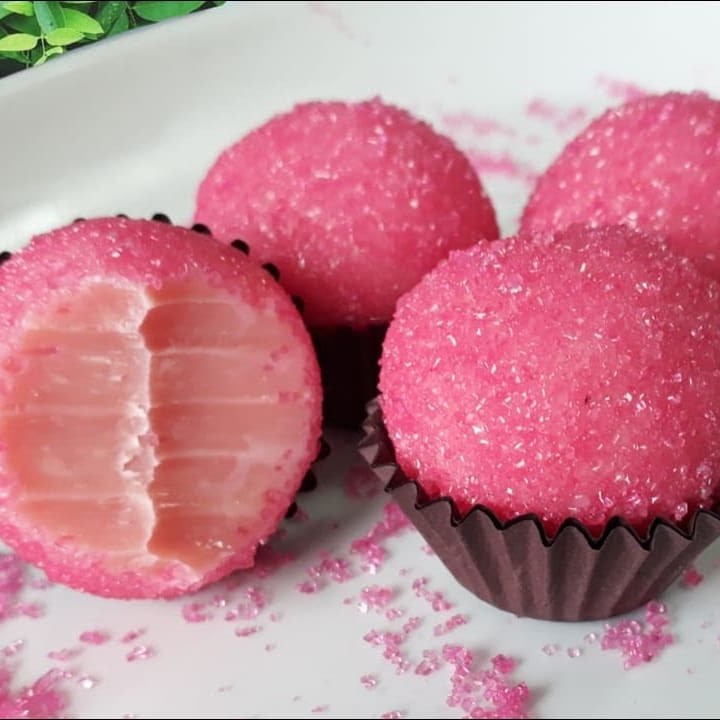 Docinho é bom e nunca é demais! Brigadeiro com sabor morango, uma delícia! Com 25g, aproximadamente.