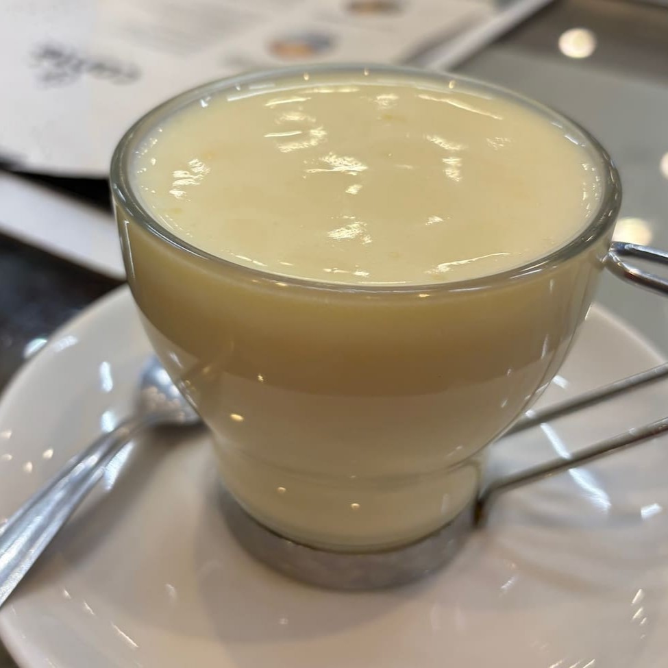 Chocolate quente branco tipo europeu (180ml). Encorpado e com sabor de chocolate branco.
