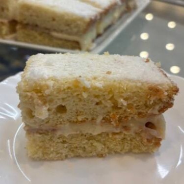 1 (Uma) fatia de bolo de coco, bem molhadinho, com recheio de creme de leite condensado e com cobertura de coco ralado. Uma delícia!