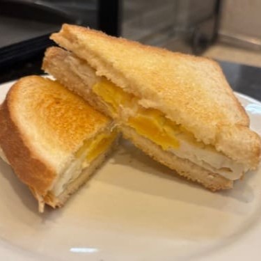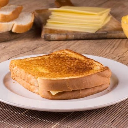 Pão de forma tostado na chapa com manteiga, recheado com 1(uma) fatia de queijo mussarela.