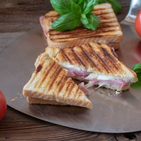 Pão de forma com manteiga, queijo e presunto, tostado na chapa.