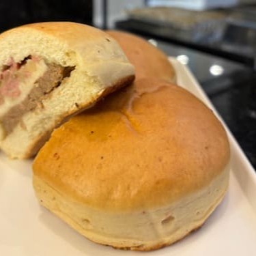 Massa bem macia, recheada com hambúrguer, queijo e presunto.