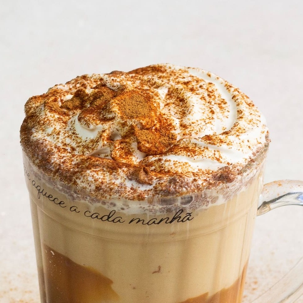Copo térmico de 240ml trufado com doce de leite, café expresso e leite vaporizado.